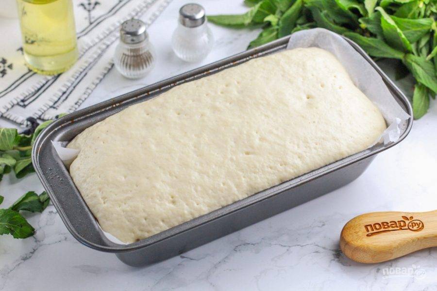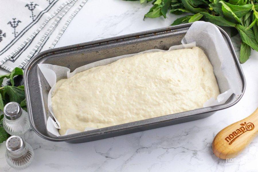Выстелите форму пергаментной бумагой и сбрызните ее растительным маслом. Выложите тесто в форму и слегка округлите. Накройте полотенцем и дайте расстояться 20-40 минут в зависимости от температуры в комнате.