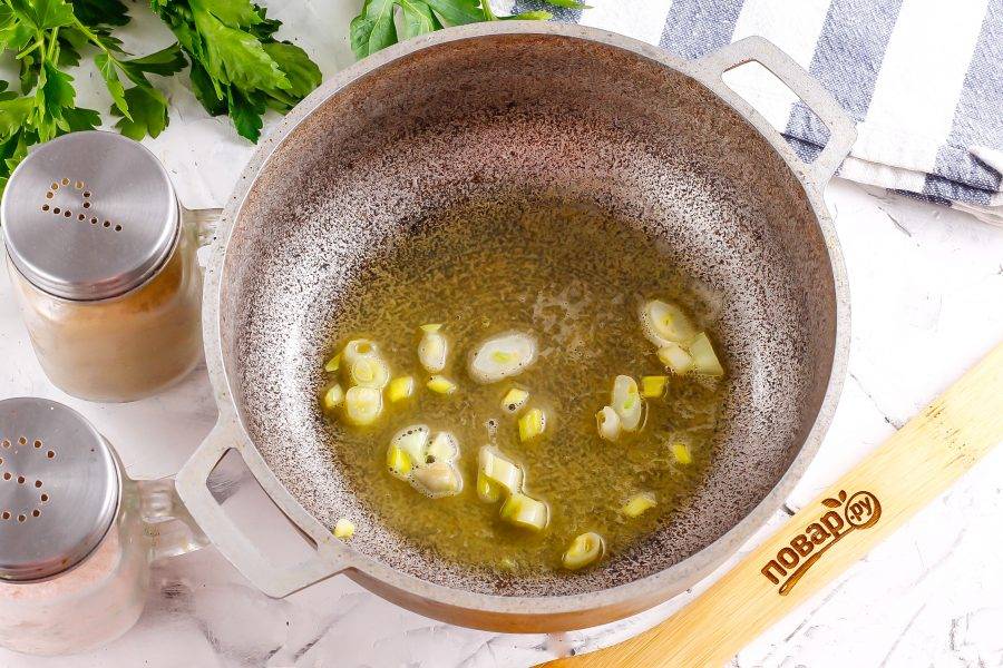Растопите в казане или кастрюле с антипригарочным дном сливочное масло. Нарежьте очищенный репчатый лук и обжарьте его в масле примерно 2-3 минуты до румяности.