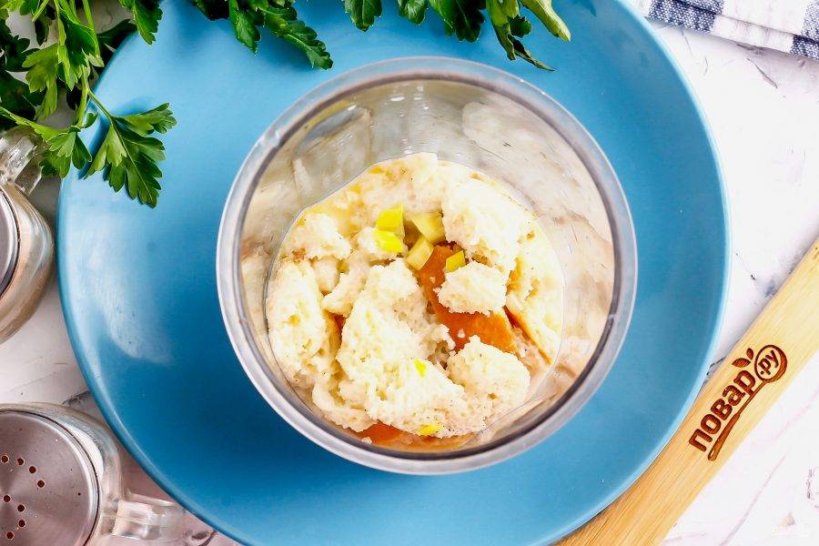 Перелейте все содержимое казана в емкость для погружного блендера или в чашу измельчителя, отпюрируйте в течение 2-3 минут, пробивая даже мелкие кусочки хлеба.