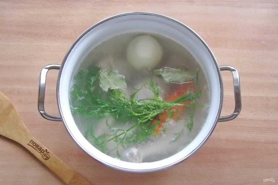 Доведите до кипения, снимите пену и убавьте огонь до минимума. Добавьте морковь и лук. В кастрюле приоткройте крышку, чтобы кипение было минимальным.