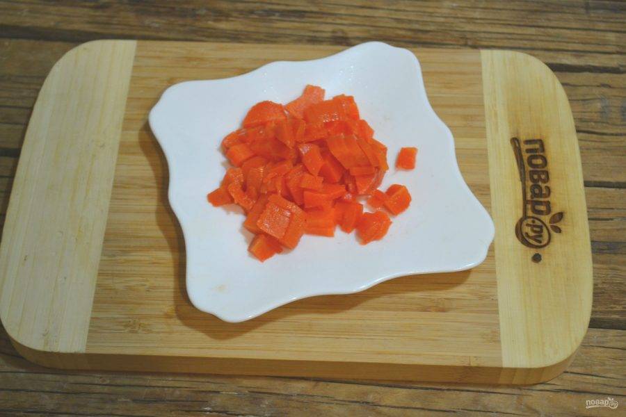 Морковь порежьте мелким кубиком. Она не только дополнит вкус холодца, но и послужит украшением для него.