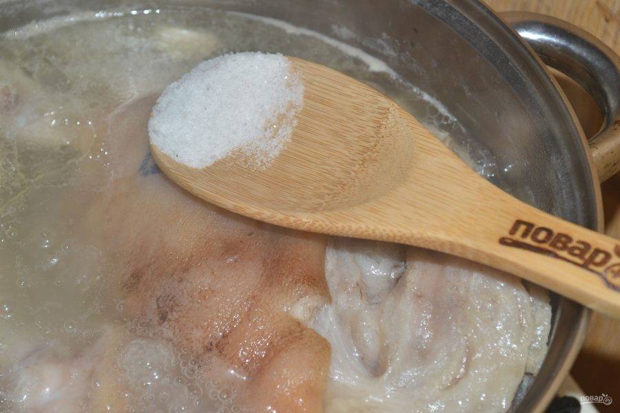 Варите холодец 3 часа, затем всыпьте соль, добавьте лавровый лист и перец горошком. Варите еще 1 час.