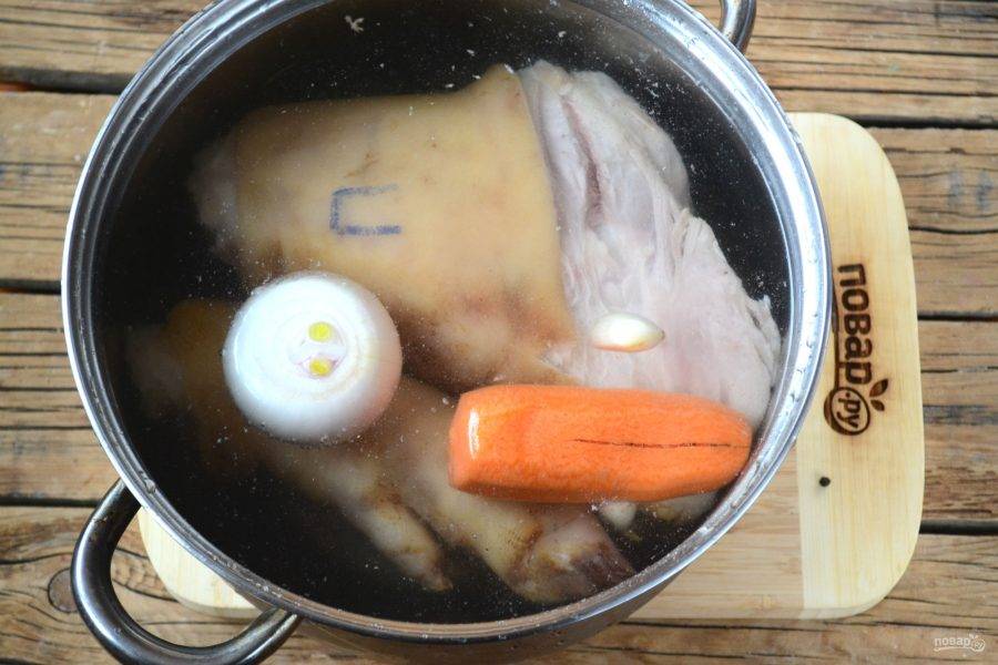 Снова сложите рульку в кастрюлю, туда же положите целую луковицу и морковь, 5-6 зубчиков чеснока. Чеснока я всегда кладу много, тогда вкус холодца получается очень насыщенным и ярким. Также немного чеснока можно выдавить прямо в тарелки, куда будете разливать холодец. Залейте рульку водой и поставьте на огонь. После закипания огонь уменьшите до минимального. Время от времени снимайте пену.