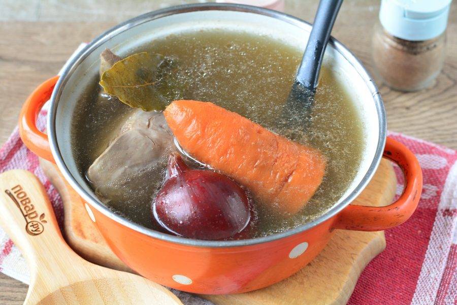 В кастрюлю добавьте морковку и промытый лук в шелухе, варите все вместе еще 20-30 минут. Также добавьте лавровый лист и перец горошком для аромата.