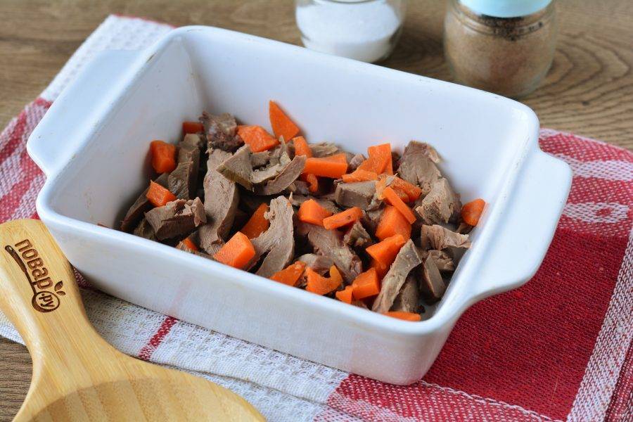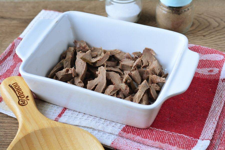 Бульон процедите, а сердце нарежьте средними кусочками. Выложите сердце в форму для холодца.