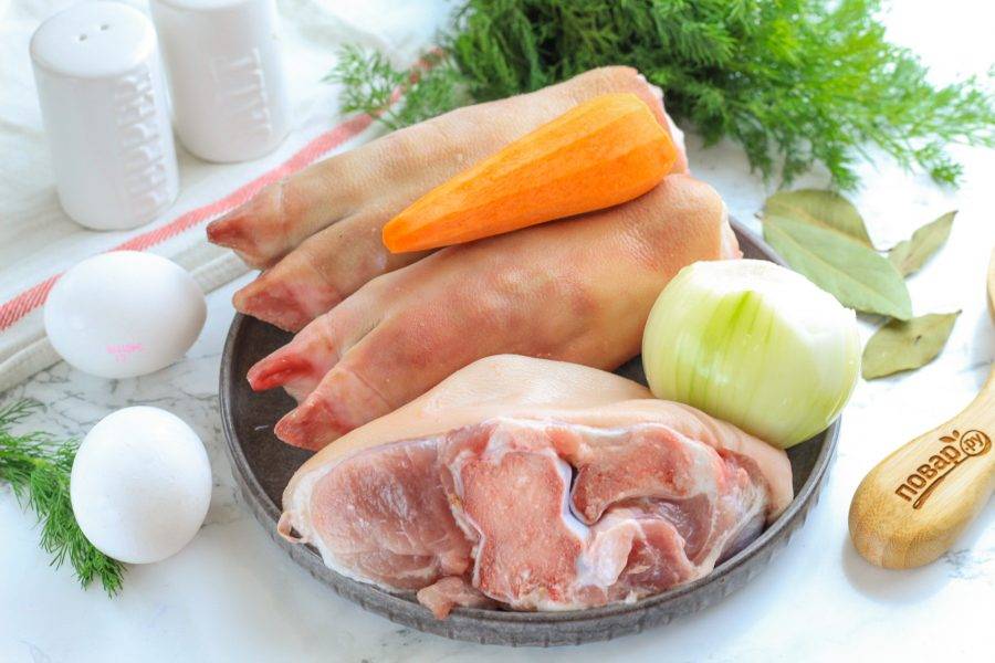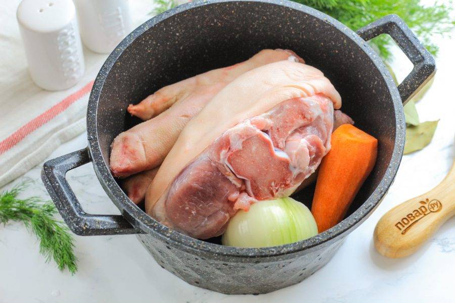 Подготовьте указанные ингредиенты. Ножки и часть рульки тщательно соскоблите, удаляя грязь, и промойте горячей водой. Морковь и лук очистите от кожуры.
