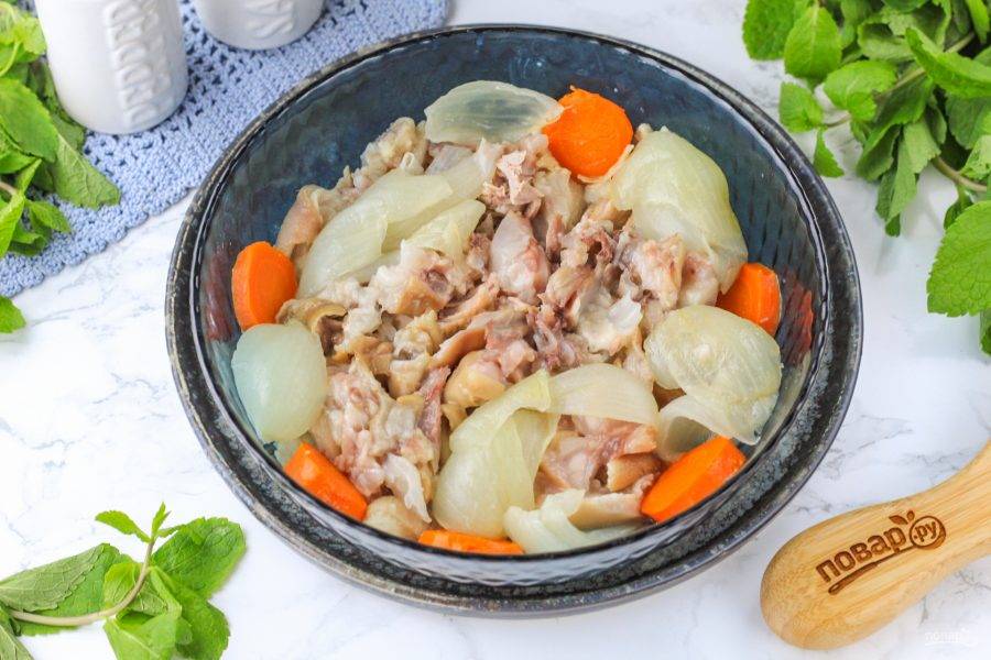 Аккуратно залейте полученным бульоном и дайте остыть при комнатной температуре 1 час. После перенесите на холод и охладите в течение 3-4 часов, чтобы холодец отлично застыл.