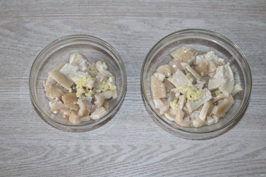 Выложите в формы для холодца, добавьте чеснок, попробуйте на соль.