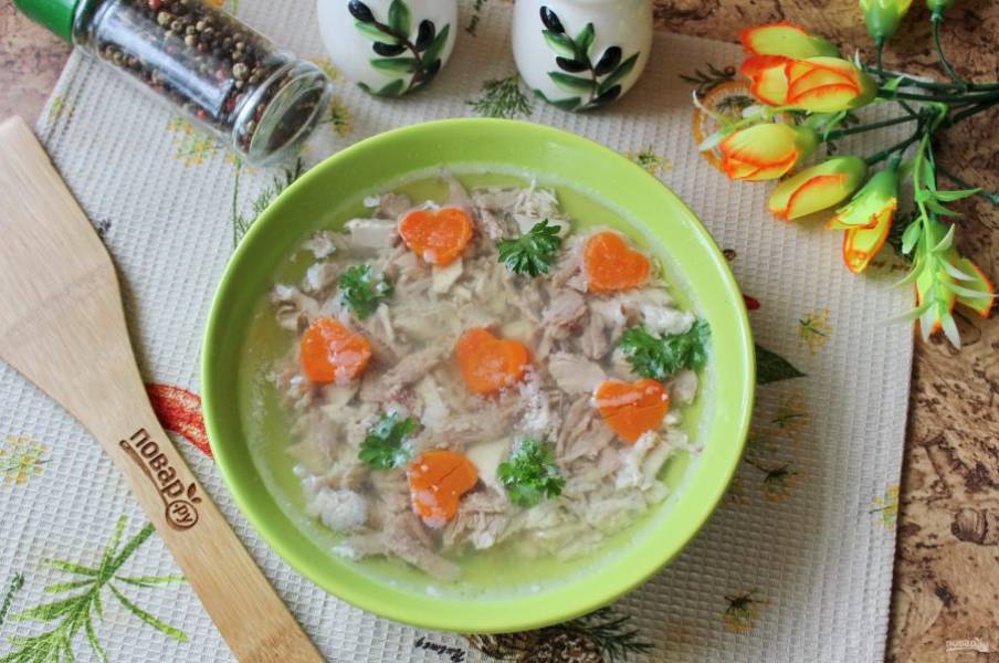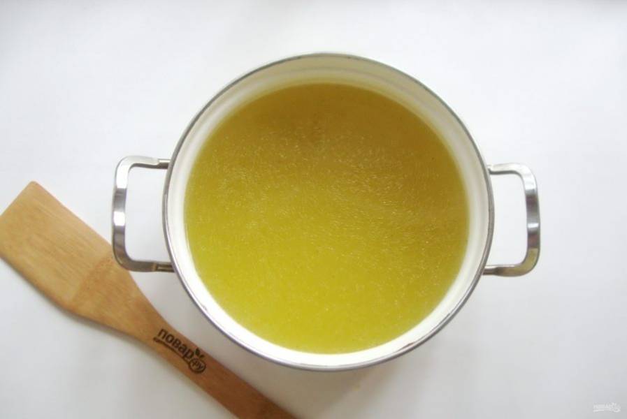 Бульон процедите. Желатин залейте 4-5 столовыми ложками холодной воды, дайте набухнуть. После выложите в горячий бульон и перемешивайте до полного растворения желатина.