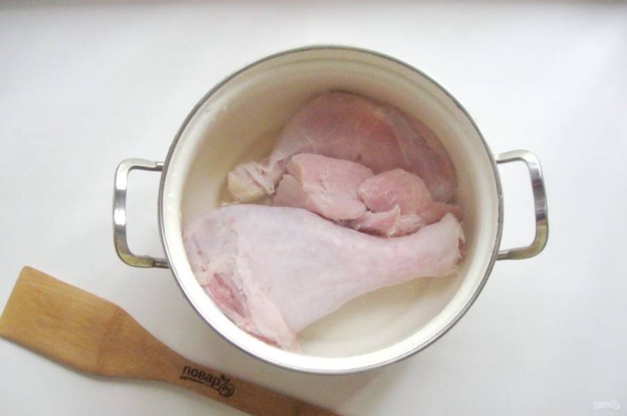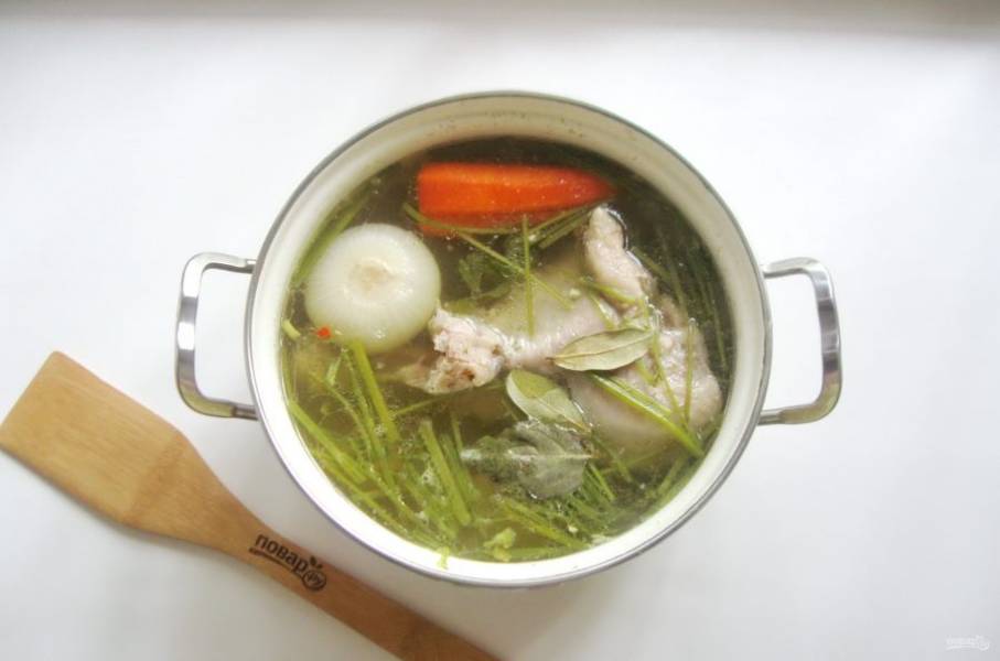 Варите мясо до готовности. Курица сварится гораздо быстрее индейки и свинины, поэтому её следует достать раньше. За 10-15 минут до окончания приготовления холодца, выложите в бульон лавровый лист, посолите и поперчите по вкусу. Можно добавить стебли укропа или петрушки.