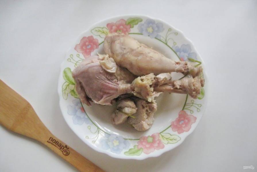 Мясо отделите от костей и кожи, мелко нарежьте и разложите по тарелкам. Добавьте измельченный чеснок, залейте бульоном. Поставьте в холод до полного застывания.