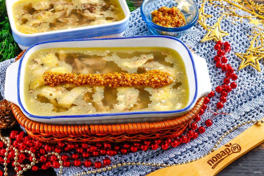 Сочный и прозрачный холодец на Новый Год можно приготовить из тушенки, добавив немного желатина. Блюдо с удовольствием съедят и родные, и гости с зерновой горчицей или с ядреным свекольным хреном.