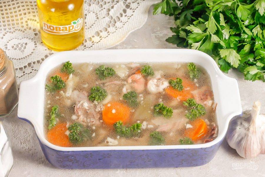 Промойте веточки кучерявой петрушки и выложите их в бульон. Поместите форму в холодильник на 3-4 часа, а еще лучше — оставьте на ночь.