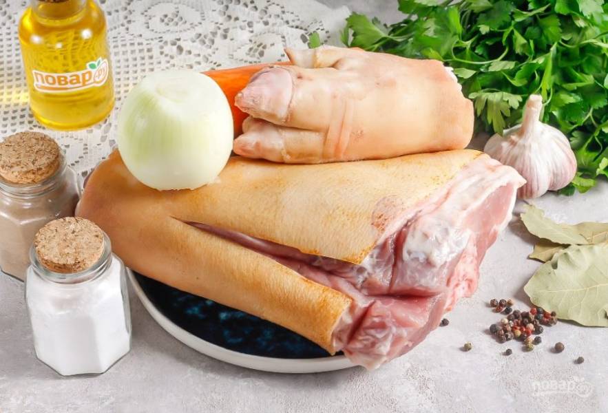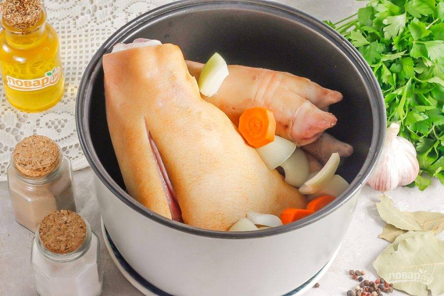Подготовьте указанные ингредиенты. Рульку и свиные ножки тщательно промойте в воде, соскоблите кожу и снова промойте. Очистите лук и морковь от кожуры, промойте в воде.