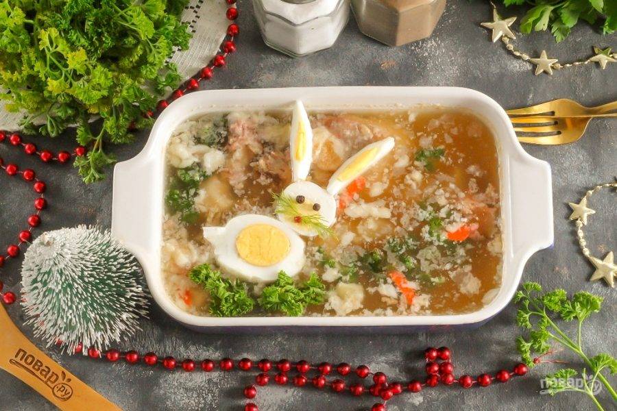 Украсьте блюдо кроликом из отварного яйца. Глазки и носик сделайте из горошин перца, а усики — из веточек укропа. Подайте холодец на праздничный стол охлажденным!
