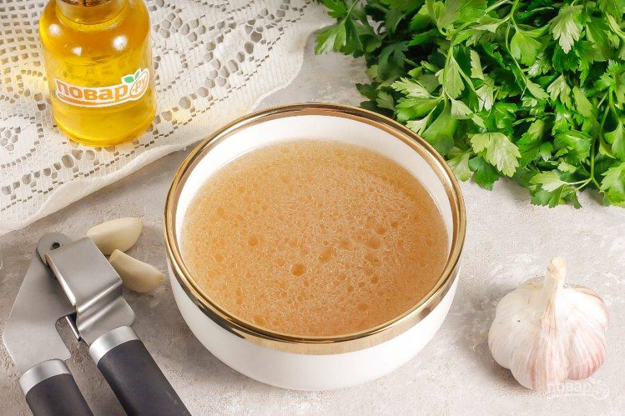 Процедите оставшийся в чаше бульон и спрессуйте в него очищенные зубчики чеснока. Попробуйте бульон на вкус, при необходимости досолите. Желатин добавлять не нужно!
