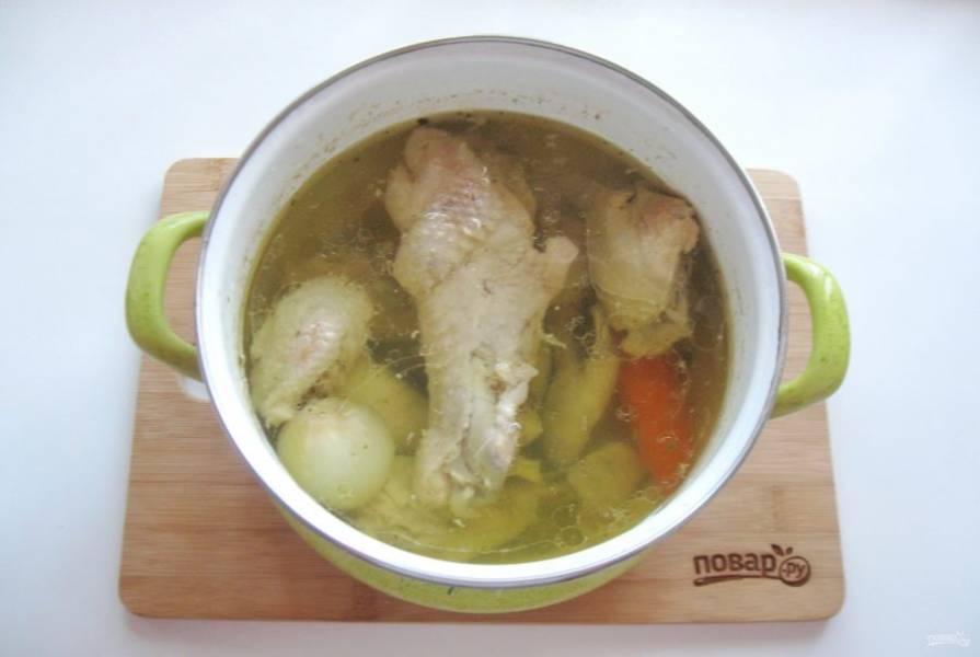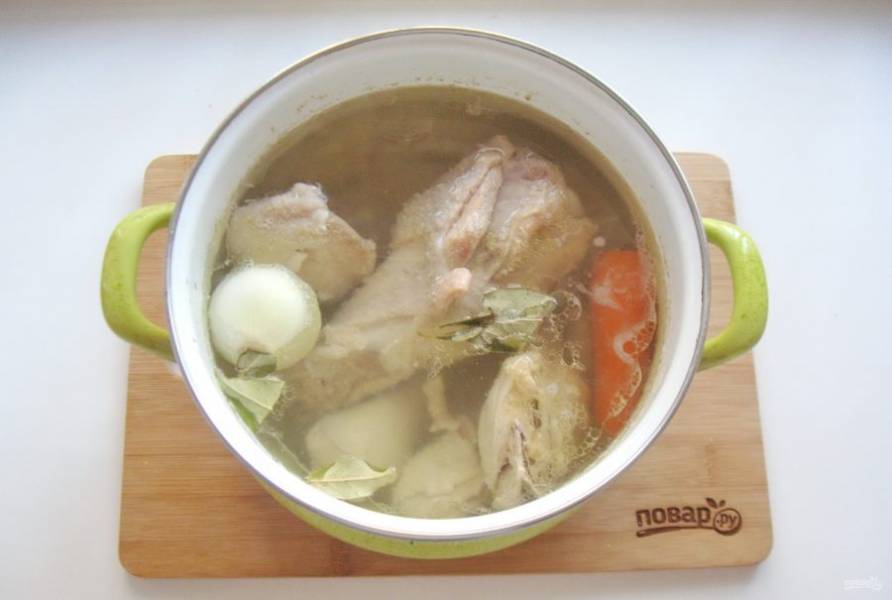 Доведите содержимое кастрюли до кипения, огонь убавьте и снимите пену. Варите холодец на самом минимальном огне, чтобы бульон буквально чуть булькал. В этом случае он получится прозрачным. Через два часа кипения добавьте очищенный лук и морковь, лавровый лист.