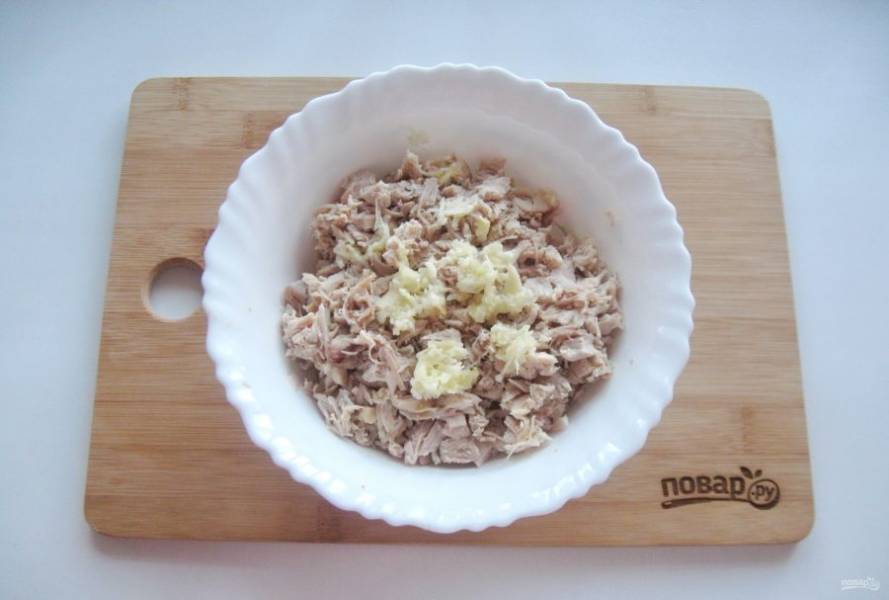 Мясо индейки и курицы очистите от шкурок, жил и костей. Должна остаться одна мякоть. Мелко нарежьте мясо и добавьте измельченный чеснок.