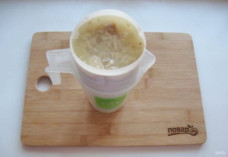 А бульон процедите. Желатин залейте 3-4 столовыми ложками холодной воды. Дайте набухнуть в течение 10 минут. Выложите в горячий бульон и мешайте до полного растворения желатина.