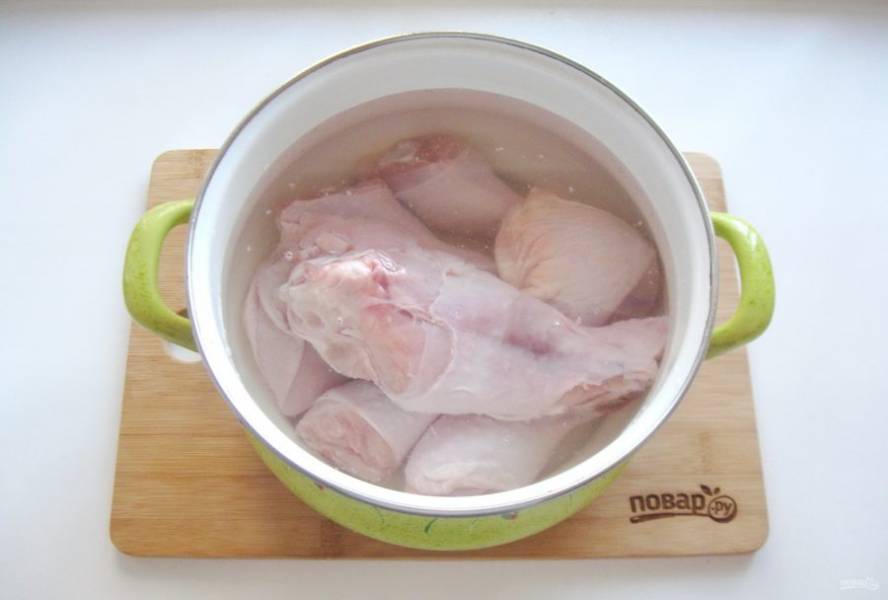 Курицу и индейку хорошо помойте и выложите в большую кастрюлю.
