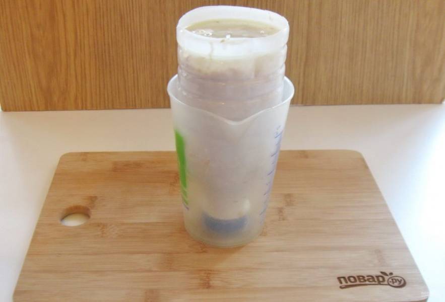 Литровую бутылку из-под молока хорошо помойте и отрежьте в ней дно. Поставьте бутылку вертикально пробкой вниз в любую высокую емкость. Выложите в бутылку холодец до самого верха.