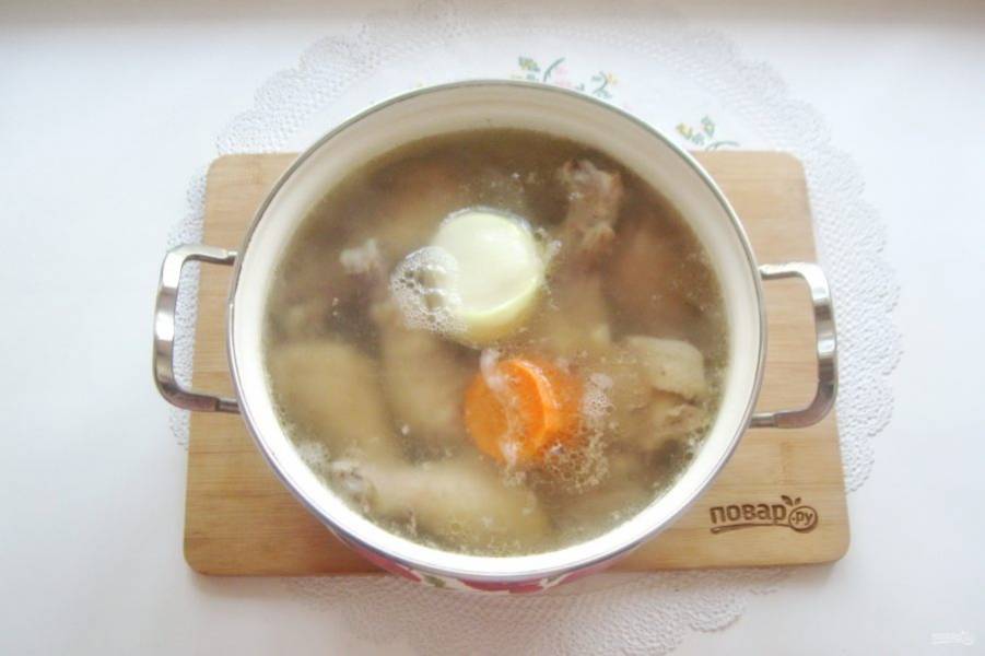 Доведите воду с курицей до кипения, снимите пену. Добавьте очищенный лук и морковь. Установите минимальный огонь. Курица должна буквально томиться, чтобы бульон был абсолютно прозрачным.