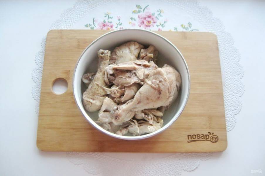 Вареную курицу достаньте из кастрюли. Удалите шкурку и кости.