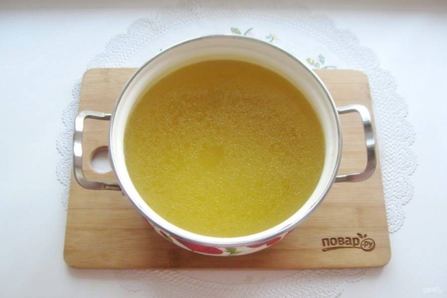 Бульон процедите. На 500 мл. бульона кладут 5-7 грамм агар-агара. В отдельную посуду налейте стакан теплого бульона и выложите в него агар-агар. Перемешайте и дайте 10-15 минут настояться. После влейте желе в процеженный бульон. Доведите его до кипения, постоянно помешивая, чтобы агар-агар полностью растворился.