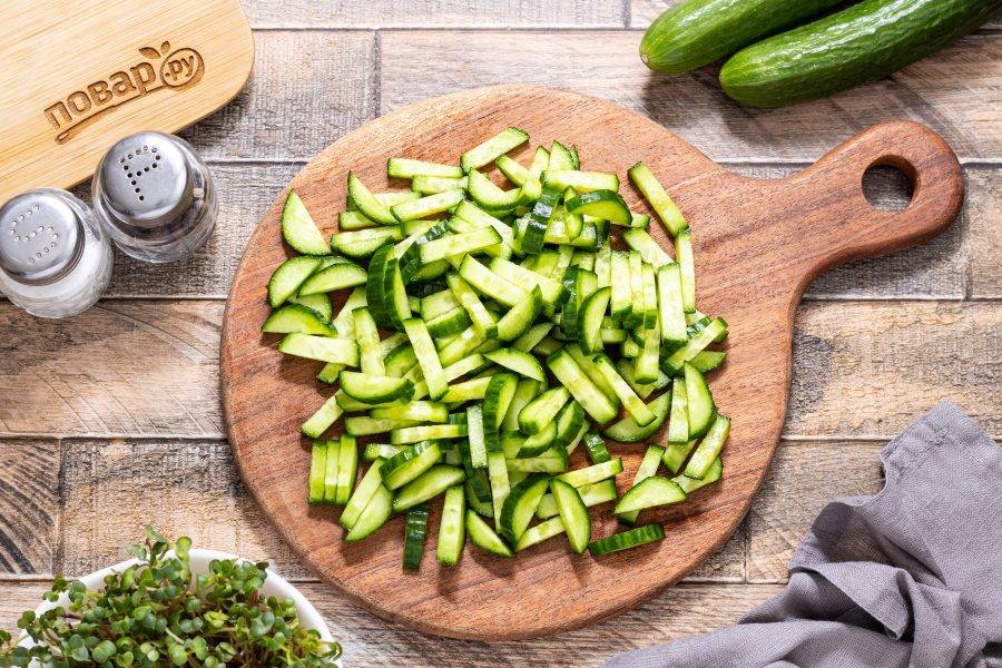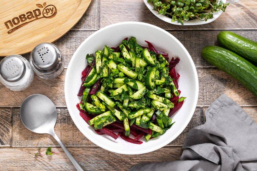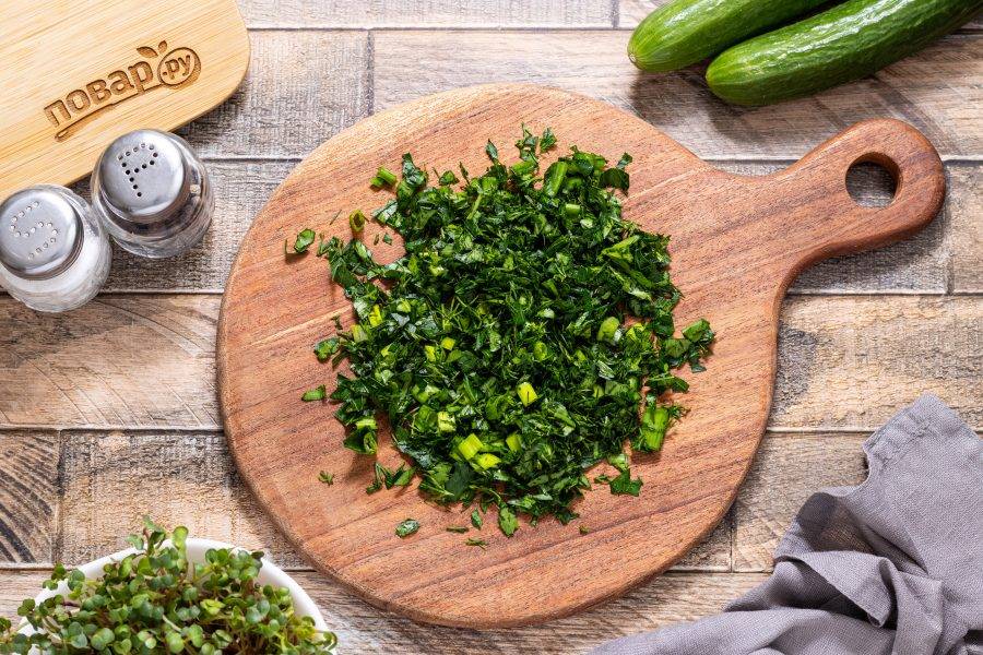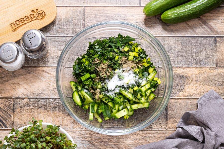 Смешайте огурцы с зеленью, чуть посолите и поперчите. Перемешайте.