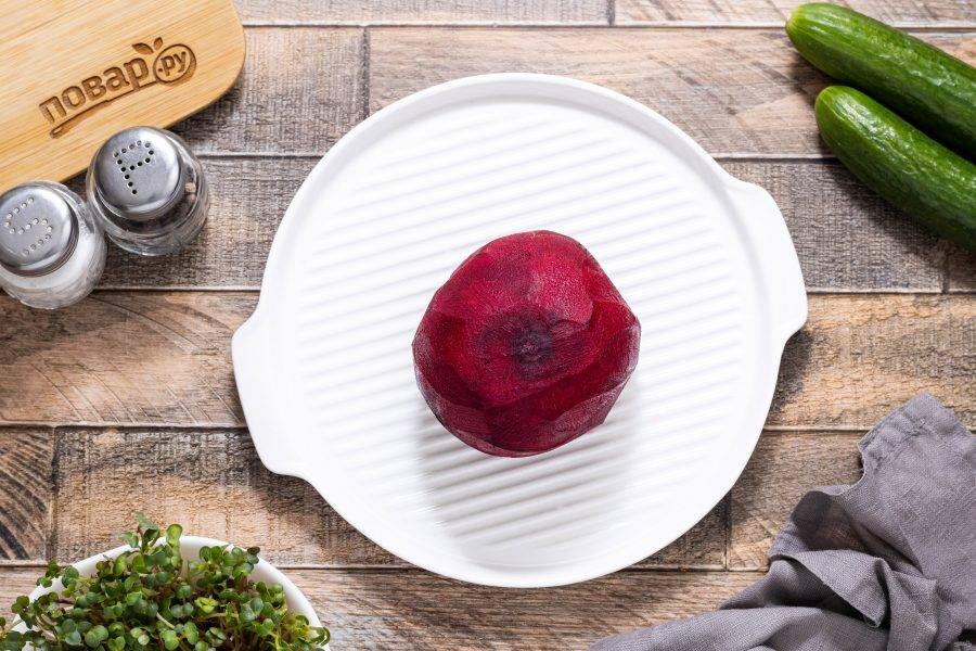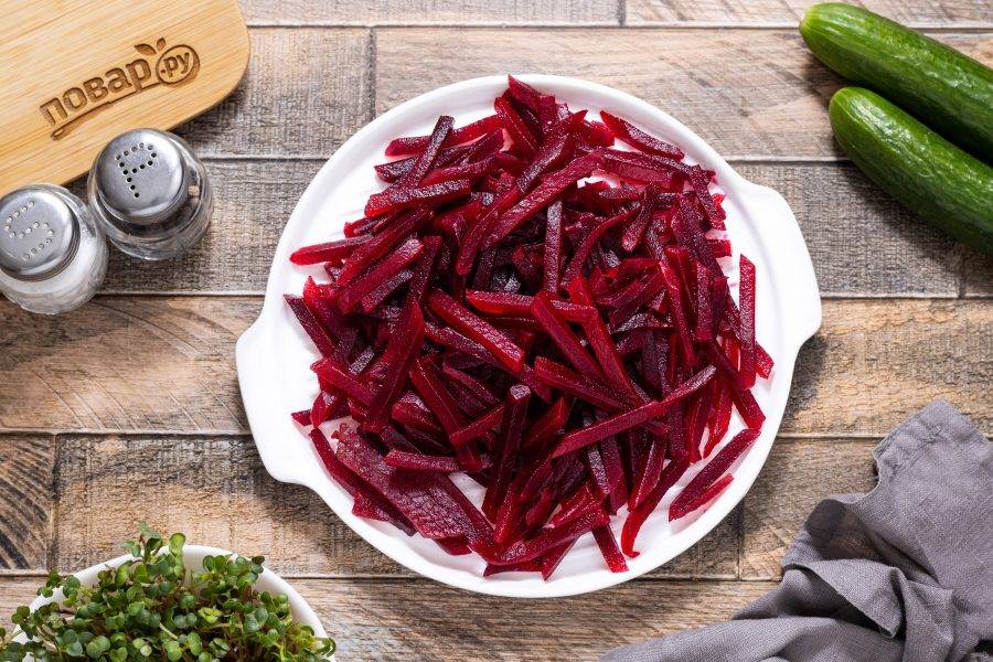 Остудите свеклу, натрите на терке или нарежьте брусочками.