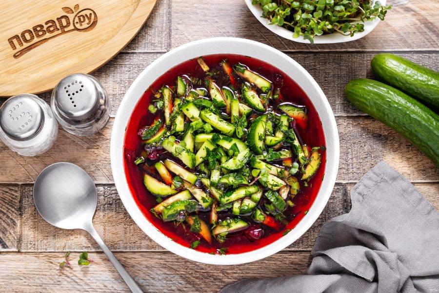 Выложите порционно овощи с зеленью в тарелку. Влейте свекольный отвар.