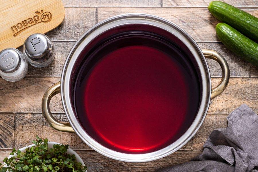 В свекольный отвар добавьте сахар, соль и лимонный сок. Охладите.