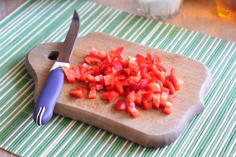 Нарежьте кубиками сладкий перец.