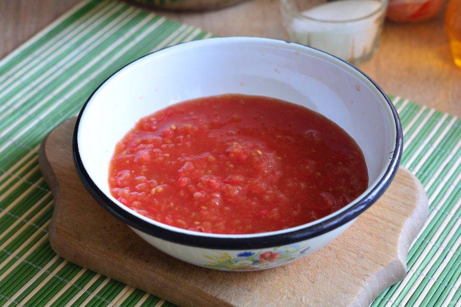 Помидоры прокрутите через мясорубку или блендер.