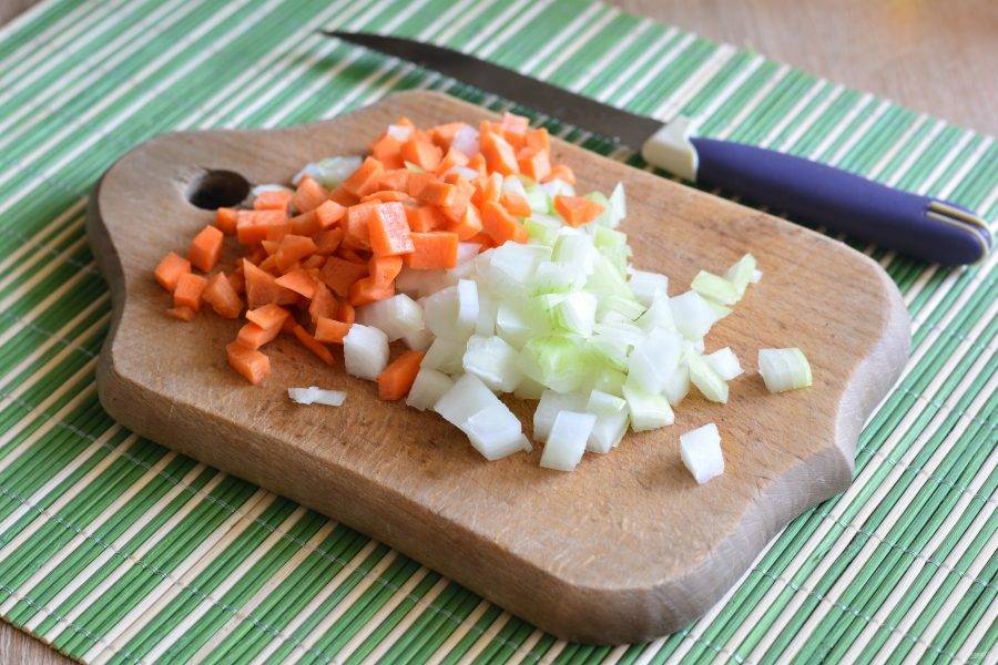 Нарежьте кубиками морковку и репчатый лук.