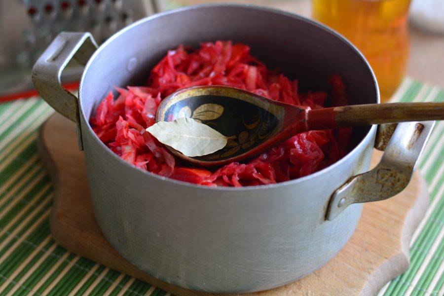 Влейте уксус и добавьте лавровый лист. Перемешайте и тушите еще 5 минут.
