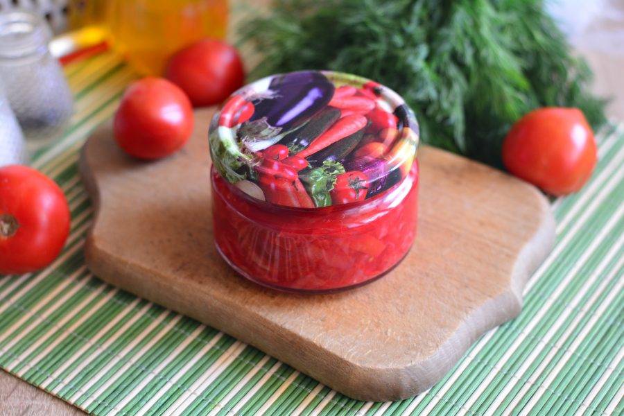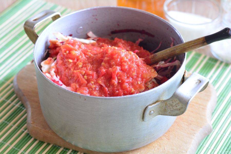 Влейте томатное пюре и немного воды. Тушите салат 20 минут на среднем огне, помешивая.