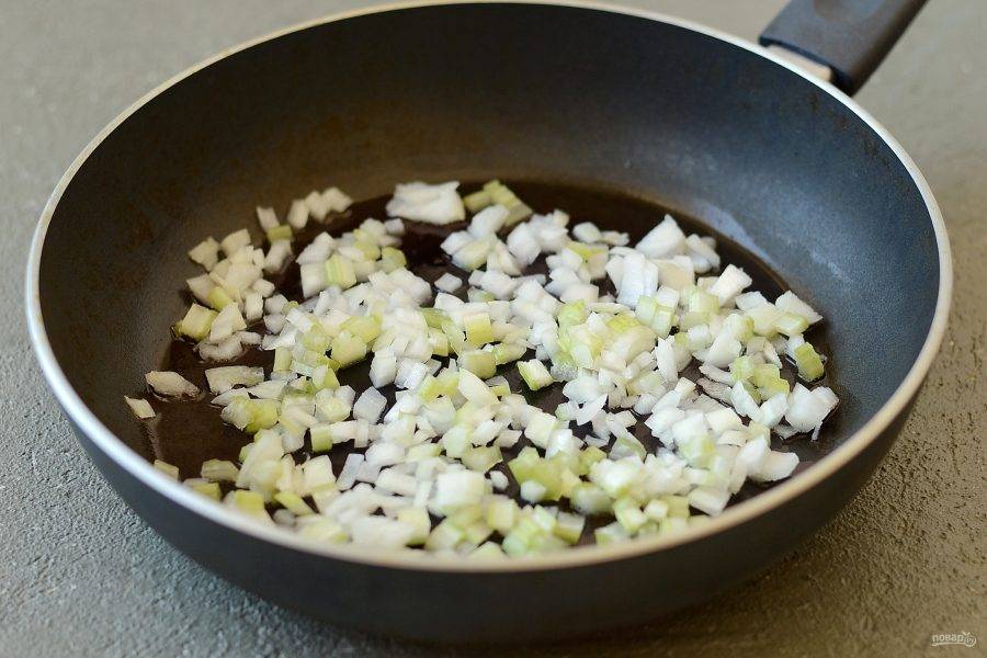 Нарежьте лук и сельдерей кубиками, обжарьте на сковороде с щепоткой соли до прозрачности.