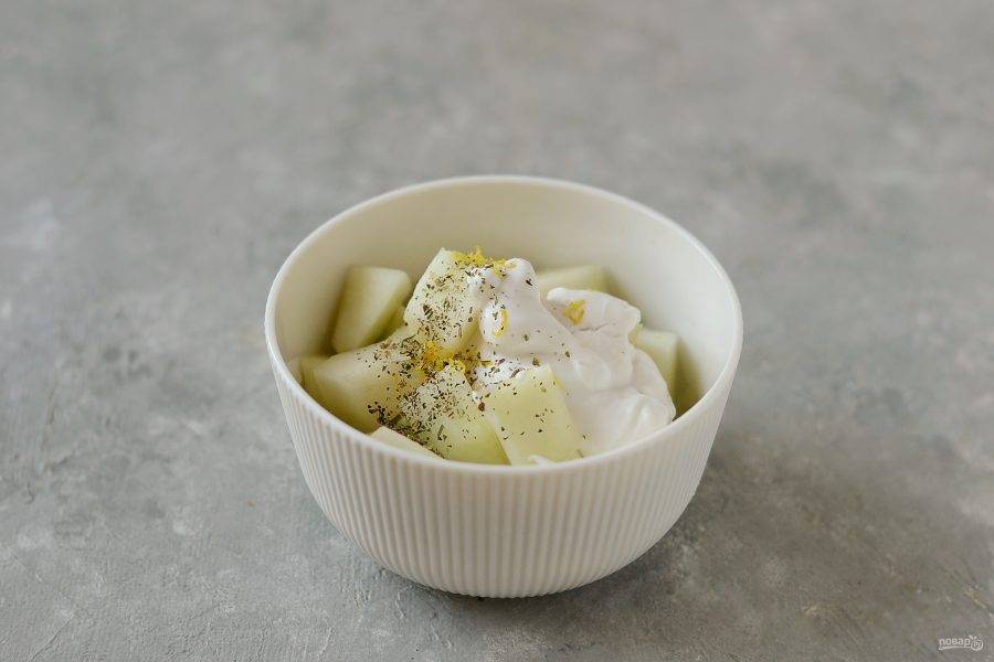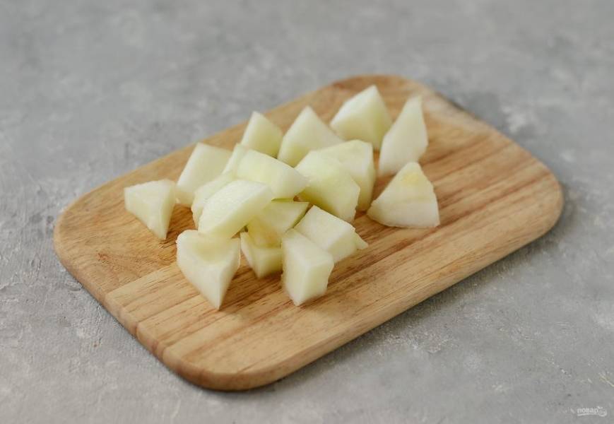 Дыню очистите от кожуры, удалите семечки и нарежьте кубиками.