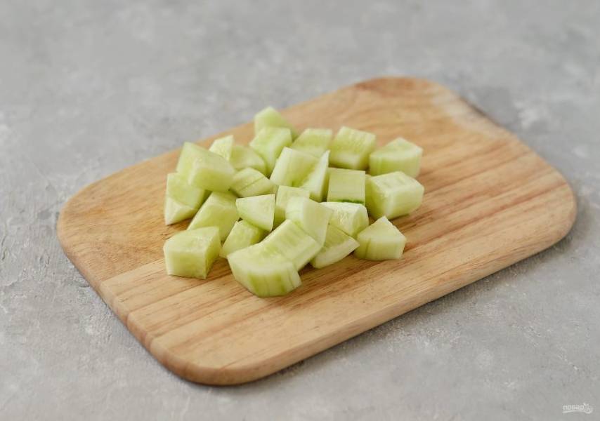 Огурец тоже очистите от кожуры, нарежьте ломтиками.