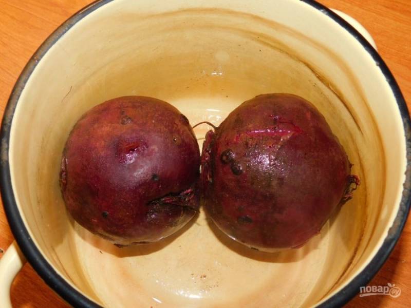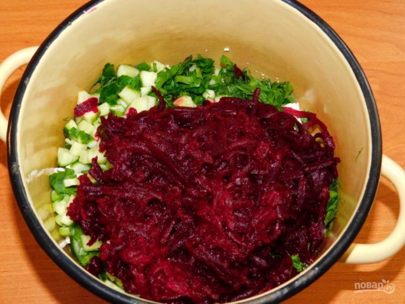 Остывшую свеклу натрите на крупной терке. Добавьте в кастрюлю.
