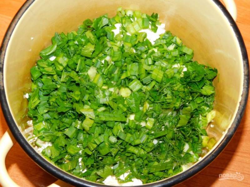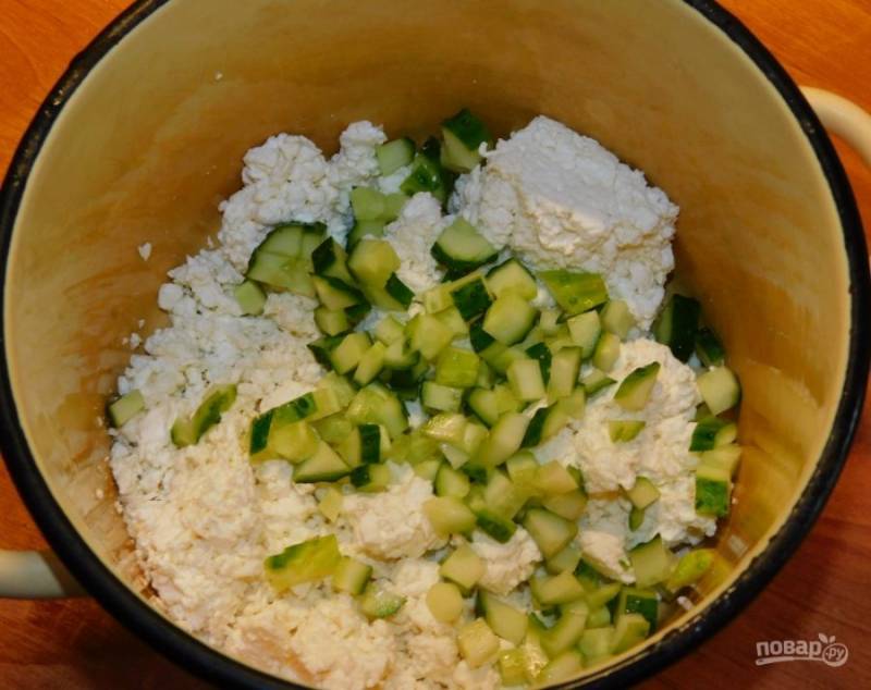 В кастрюлю, в которой будете готовить холодник, выложите творог. Добавьте нарезанные огурцы.