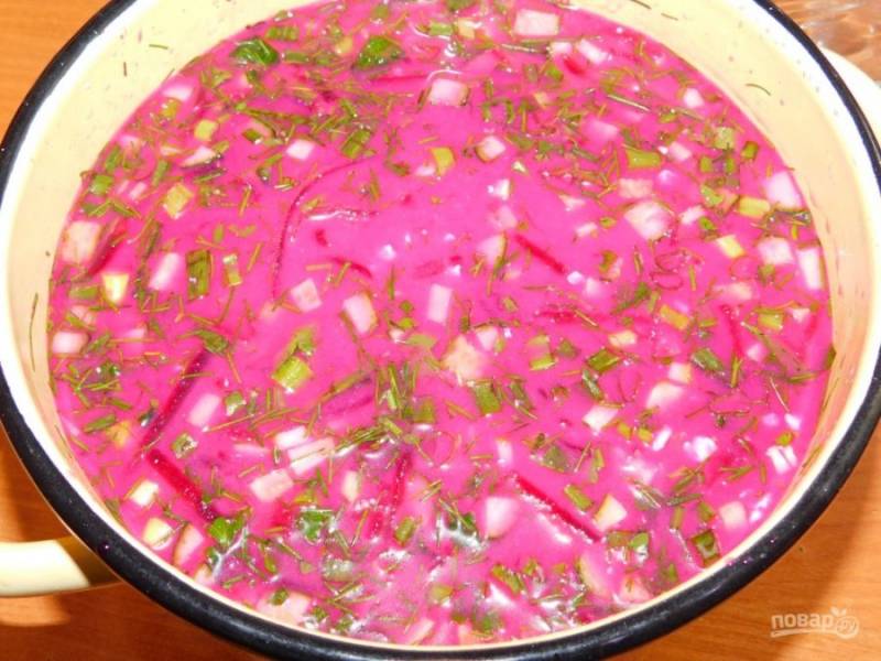 Освежающий ароматный холодный борщ — идеальное блюдо для летнего зноя. Оно популярно в мире и под другим названием — белорусский холодник. Готовится блюдо на кефире.