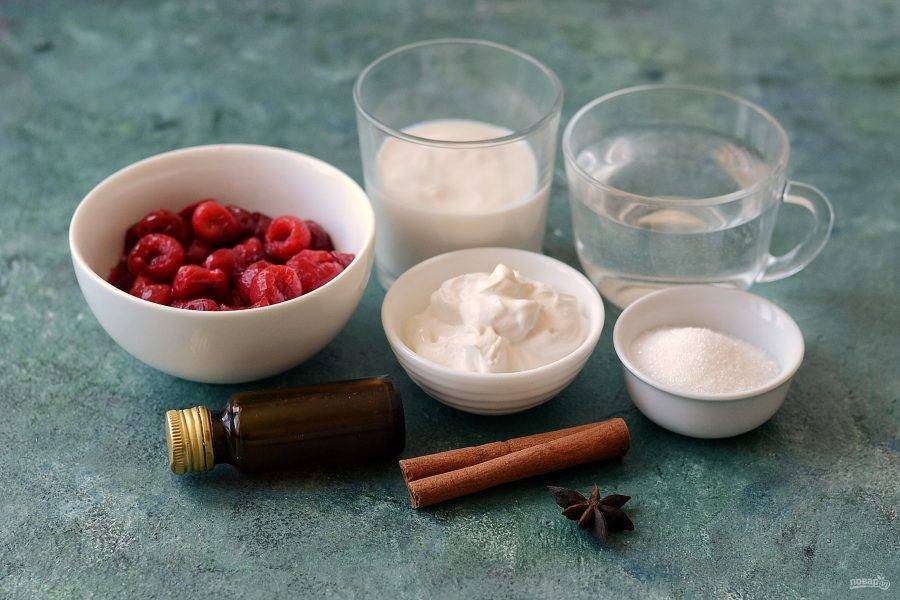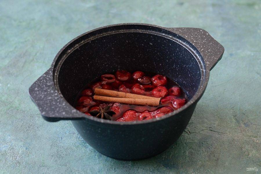 Поставьте воду с вишней и сахаром на средний огонь. Добавьте ванильный экстракт, корицу и бадьян. Доведите до кипения, варите 5-7 минут.