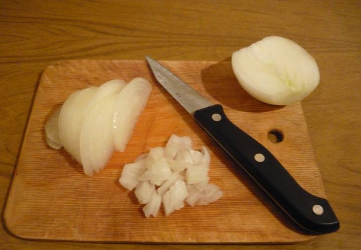 4. Лук чистим, нарезаем полукольцами или просто измельчим в блендере.