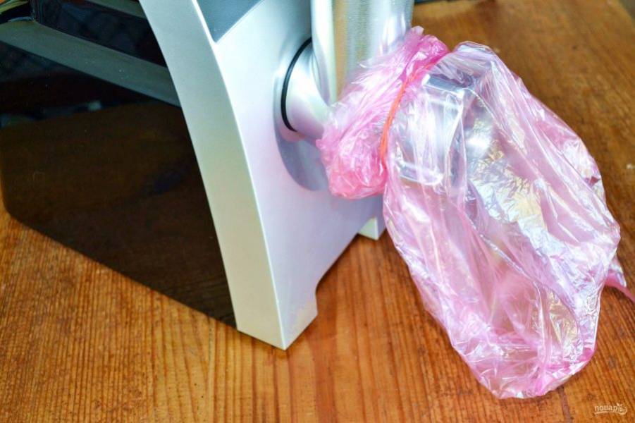 На мясорубку оденьте пакет и закрепите его при помощи резинки. Таким образом, при работе с хреном, вы не будете испытывать неудобств.