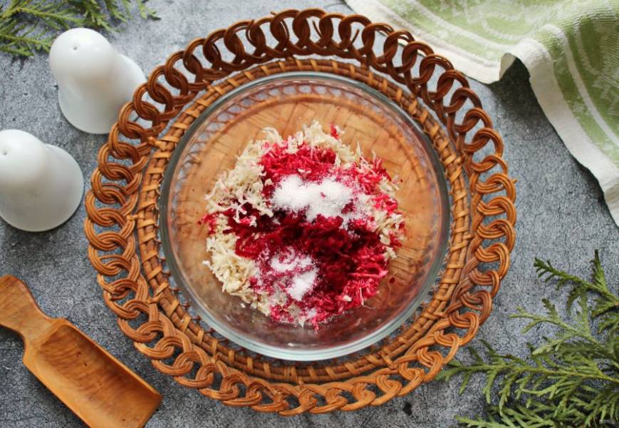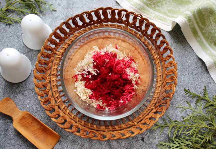 Свеклу натрите на мелкой терке и выжмите сок в миску с хреном. При желании можно добавить часть свеклы в миску с корнем.