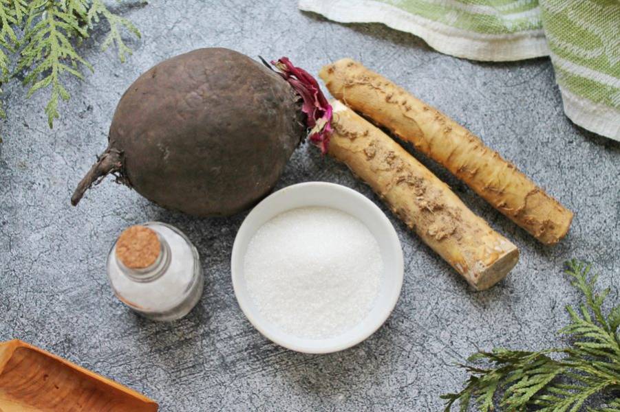 Подготовьте все необходимые ингредиенты для приготовления хрена со свеклой без уксуса.