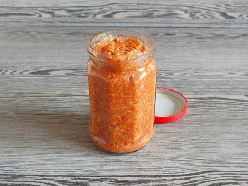 Полученной массой наполните чистые, сухие баночки. Закройте крышкой. Уберите заготовку в холодильник. Дегустировать можно через неделю.