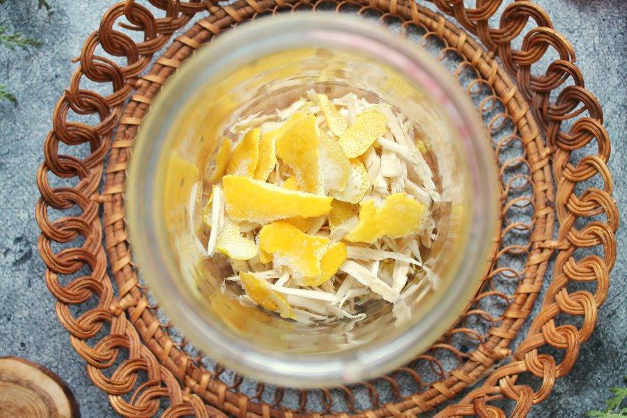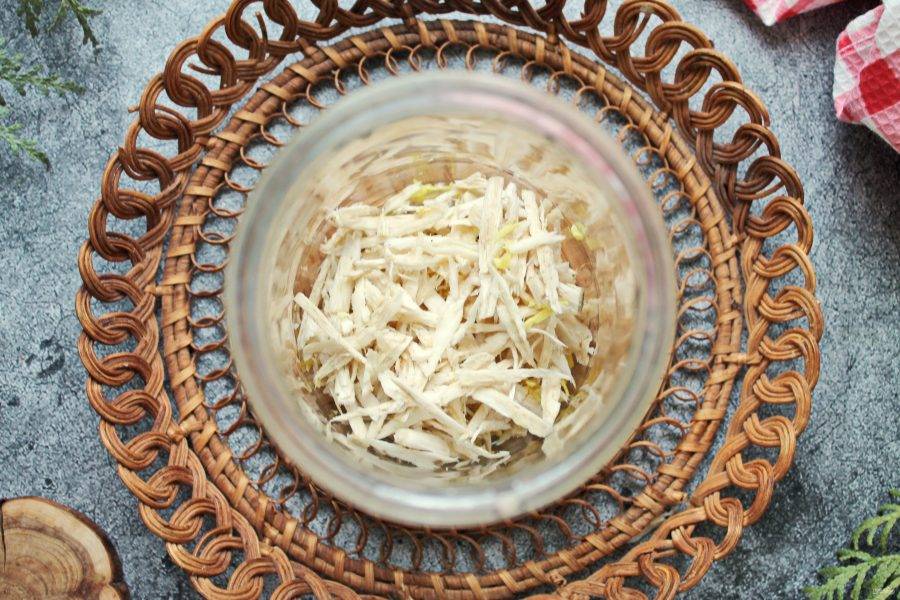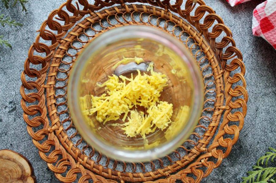 Имбирь натрите на средней терке и выложите в чистую, сухую банку.